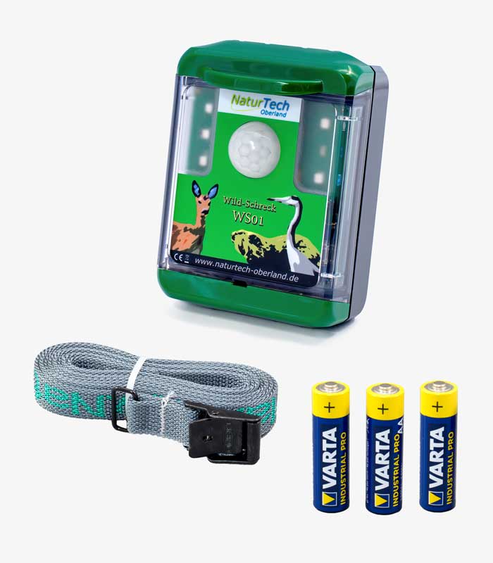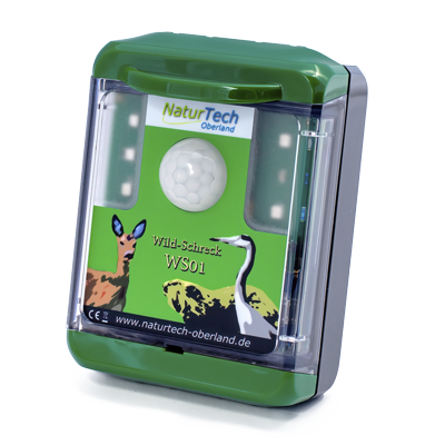 Der Wild-Schreck WS01 ist ein modernes innovatives Gerät für die gezielte, lokale Vergrämung von Wildtieren. Wildtiere werden in einem begrenzten Bereich von max. 15m über den integrierten Bewegungssensor erfasst und unmittelbar durch Lichtsignale und Geräusche vertrieben. Die optisch/akustischen Signale sind in ihrer Länge zeitlich auf das notwendigste reduziert. Damit werden unnötige Störungen von Mensch und Tier vermieden, was den Einsatz des Wild-Schrecks WS01 auch in sensiblen Gebieten, wie z.B. Naturschutzflächen und Siedlungsbereichen ermöglicht. Da viele Wildtiere nachtaktiv sind, kann der Wild-Schreck WS01 mit dem Nachtmodus tagsüber auf Wunsch deaktiviert werden.